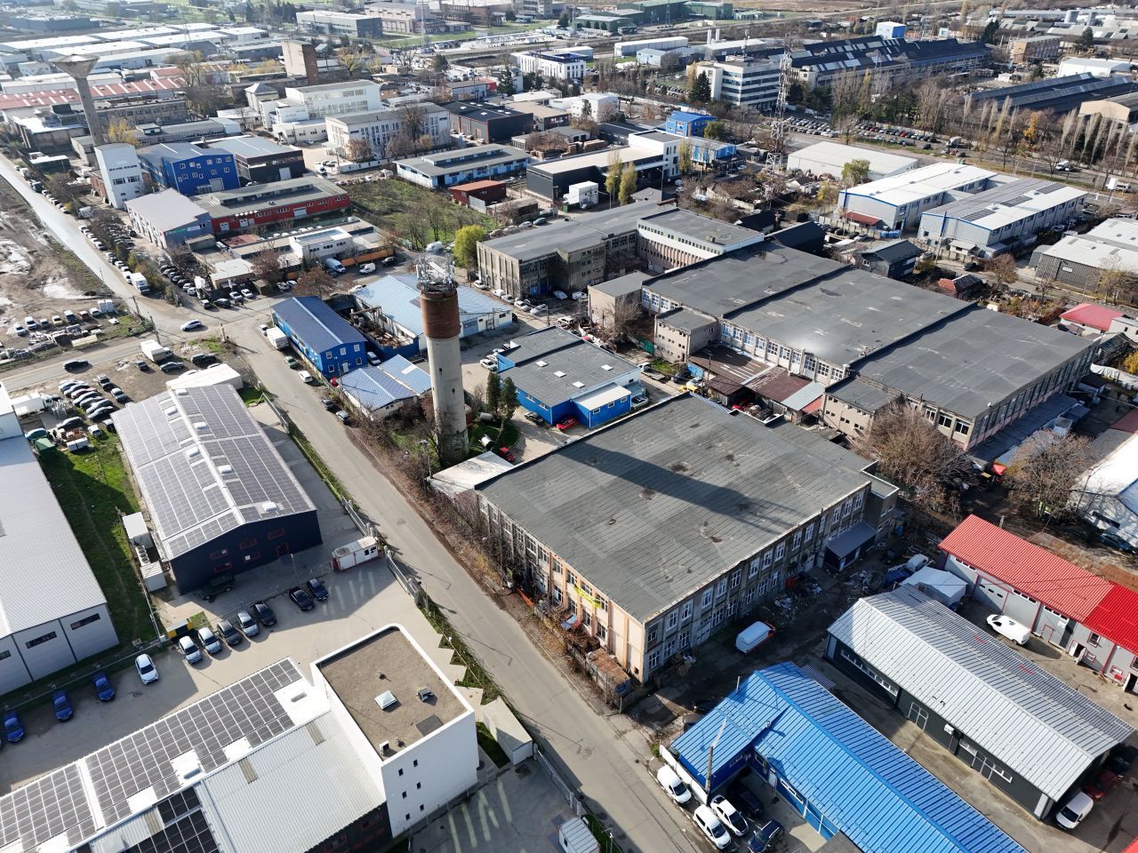 Zonă industrială cu străzi asfaltate și canalizare