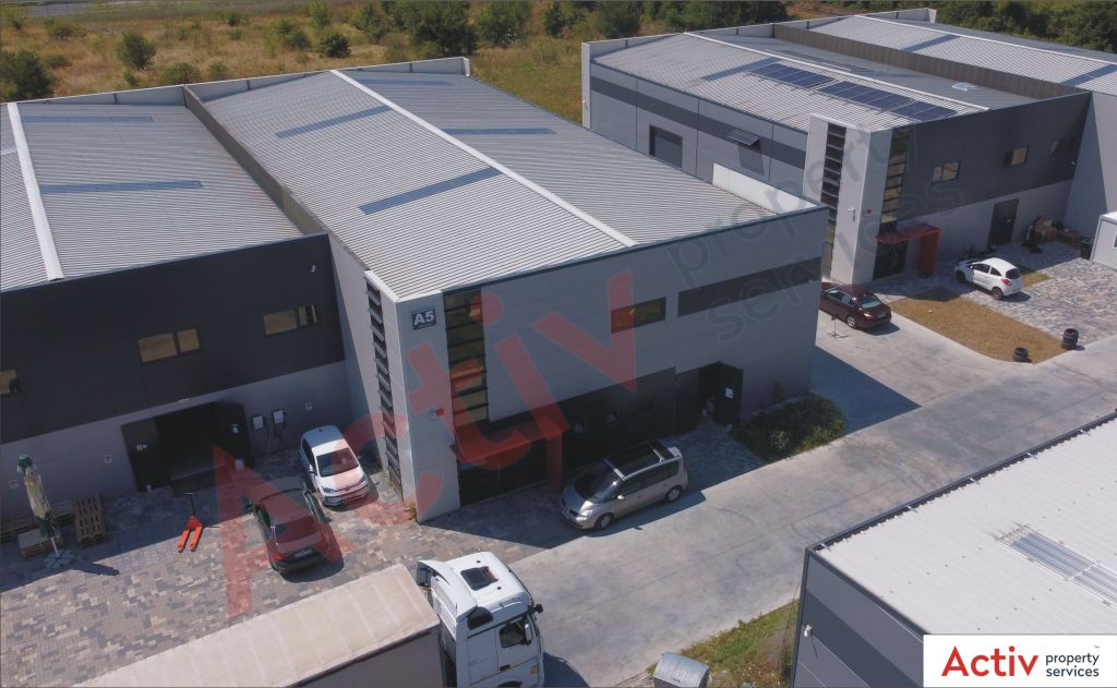 Cladirea A5 este compusa din 537 mp depozitare/productie (Parter) si 49 mp spatii administrative/sanitare (P) si 49 mp mezanin industrial ce beneficiaza de toate standardele moderne specifice clasei A cu dotari precum : temperatura ambientala controlata HVAC in cadrul suprafetei de depozitare, echipare PSI risc mare de incendiu, instalatie HVAC, inaltime libera minim 6 metri, grad minim incarcare pardoseala 5 t/mp, iluminat LED, doua grupuri sanitare, doua cai de acces marfa si o cale de acces separat personal etc.